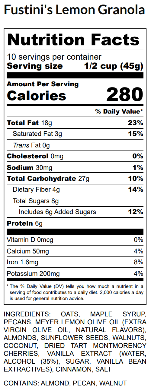 Golden and gently crisp, this granola layers bright Meyer Lemon Olive Oil with Harwood Gold maple syrup, toasted oats, Michigan cherries, and vanilla. Naturally sweet, citrusy, and sunkissed —this granola pairs beautifully with yogurt, packs easily, and brings a spark to every bite.